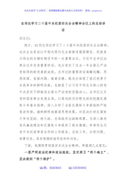 / 在传达学习二十届中央纪委四次全会精神会议上的总结讲话