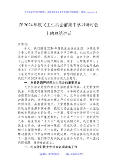 / 在2024年度民主生活会前集中学习研讨会上的总结讲话