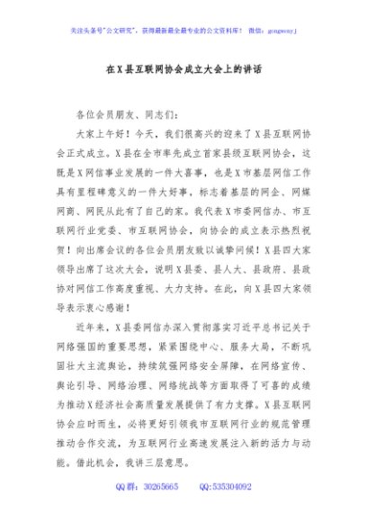 / 在X县互联网协会成立大会上的讲话