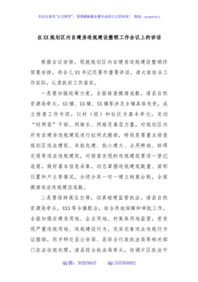 / 在XX规划区内自建房违规建设整顿工作会议上的讲话
