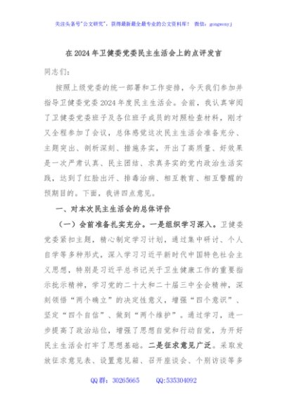 / 在2024年卫健委党委民主生活会上的点评发言
