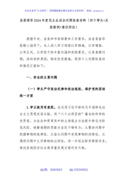 / 县委领导2024年度民主生活会对照检查材料(四个带头+反面案例+意识形态)