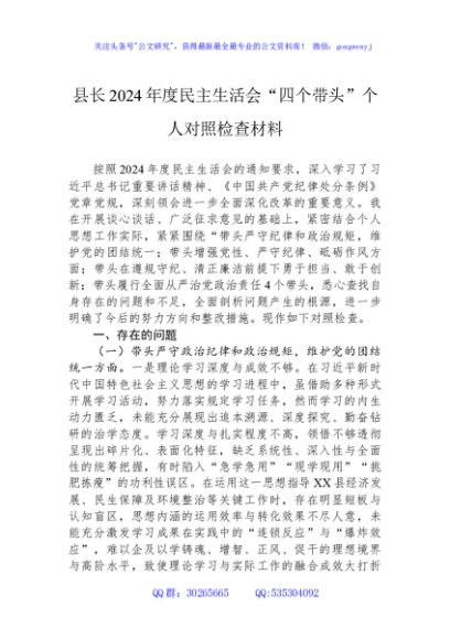 / 县长2024年度民主生活会“四个带头”个人对照检查材料