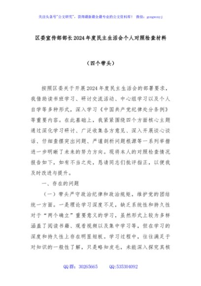 / 区委宣传部部长2024年度民主生活会个人对照检查材料(四个带头)