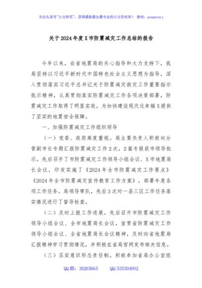 / 关于2024年度X市防震减灾工作总结的报告