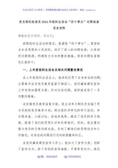 / 党支部纪检委员2024年组织生活会“四个带头”对照检查发言材料