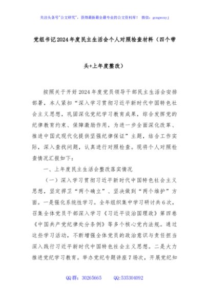 / 党组书记2024年度民主生活会个人对照检查材料(四个带头+上年度整改)