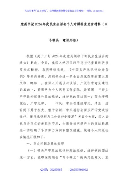 / 党委书记2024年度民主生活会个人对照检查发言材料(四个带头+意识形态)