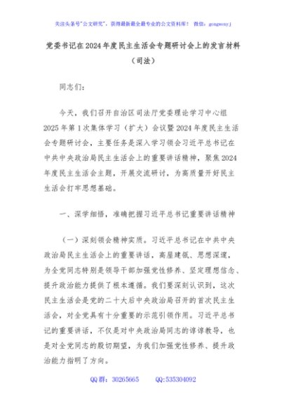/ 党委书记在2024年度民主生活会专题研讨会上的发言材料(司法)