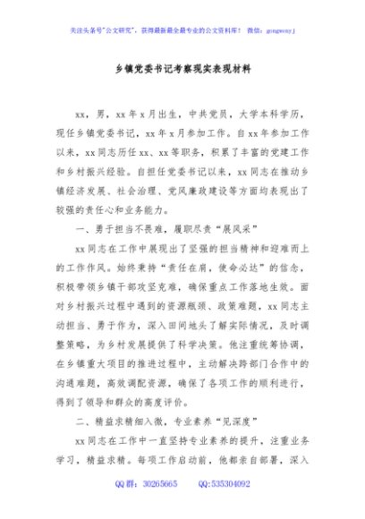 / 乡镇党委书记考察现实表现材料