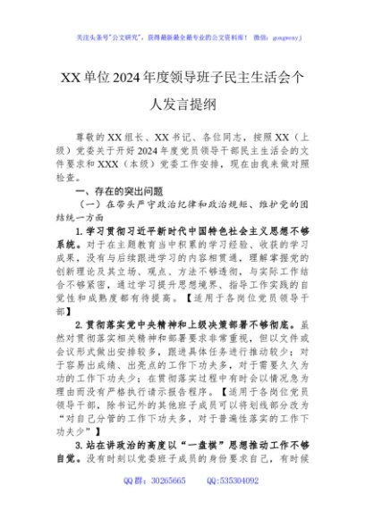 / XX单位2024年度领导班子民主生活会个人发言提纲