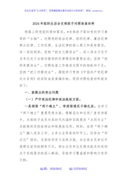 / 2024年组织生活会支部班子对照检查材料