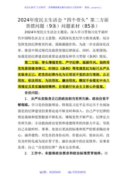 / 2024年度民主生活会“四个带头”第二方面查摆问题(9条)问题素材(85条)