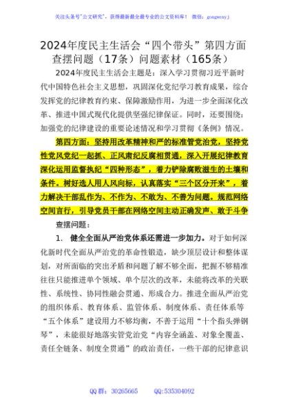 / 2024年度民主生活会“四个带头”第四方面查摆问题(17条)问题素材(165条)