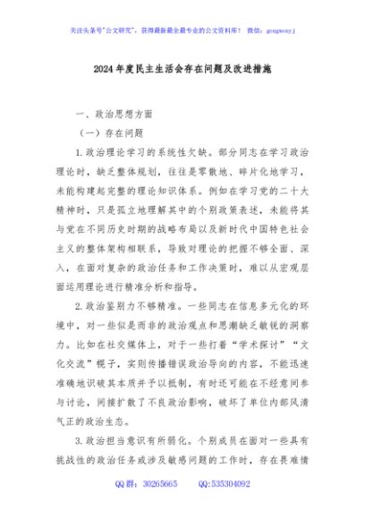 / 2024年度民主生活会存在问题及改进措施
