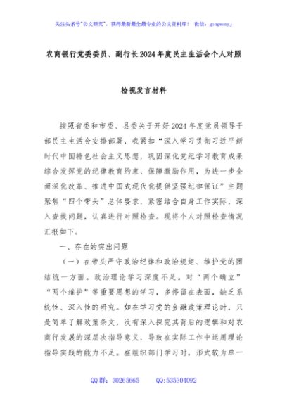 / 农商银行党委委员、副行长2024年度民主生活会个人对照检视发言材料