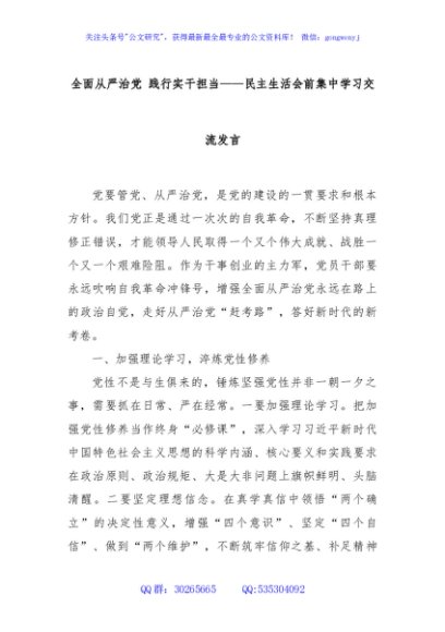 / 全面从严治党 践行实干担当——民主生活会前集中学习交流发言