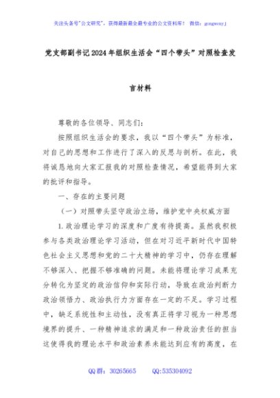 / 党支部副书记2024年组织生活会“四个带头”对照检查发言材料