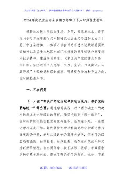 / 2024年度民主生活会乡镇领导班子个人对照检查材料