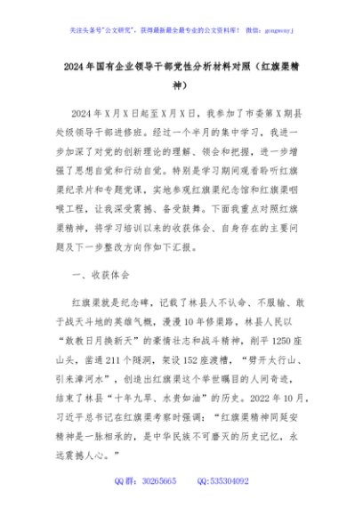 / 2024年国有企业领导干部党性分析材料对照(红旗渠精神)