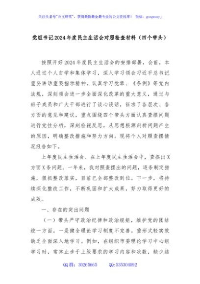 / 党组书记2024年度民主生活会对照检查材料(四个带头)