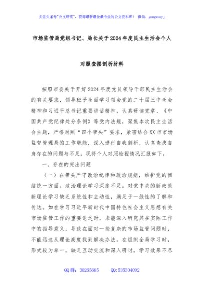 / 市场监管局党组书记、局长关于2024年度民主生活会个人对照查摆剖析材料