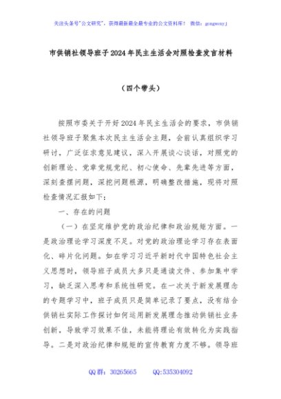 / 市供销社领导班子2024年民主生活会对照检查发言材料(四个带头)