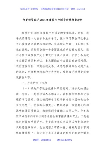 / 市委领导班子2024年度民主生活会对照检查材料