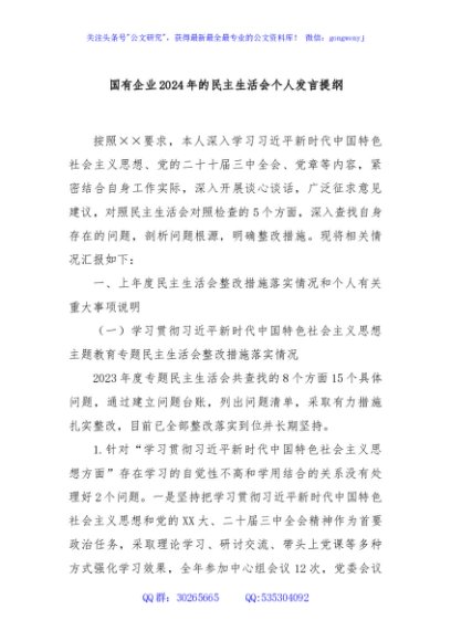 / 国有企业2024年的民主生活会个人发言提纲