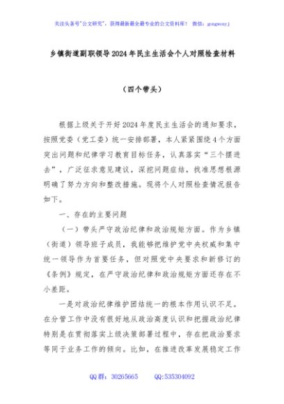 / 乡镇街道副职领导2024年民主生活会个人对照检查材料(四个带头)
