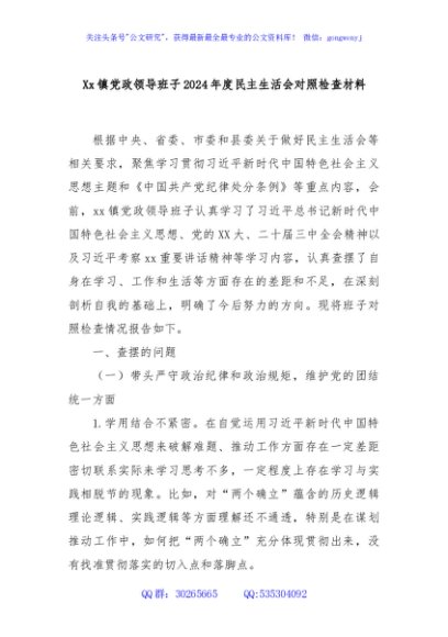 / Xx镇党政领导班子2024年度民主生活会对照检查材料