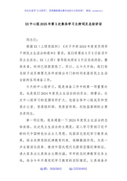 / XX中心组2025年第X次集体学习主持词及总结讲话