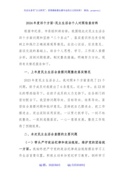 / 2024年度四个方面-民主生活会个人对照检查材料
