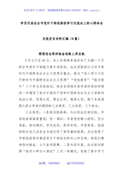 / (8篇)学员代表在全市党外干部进修班学习交流会上的心得体会交流发言材料汇编