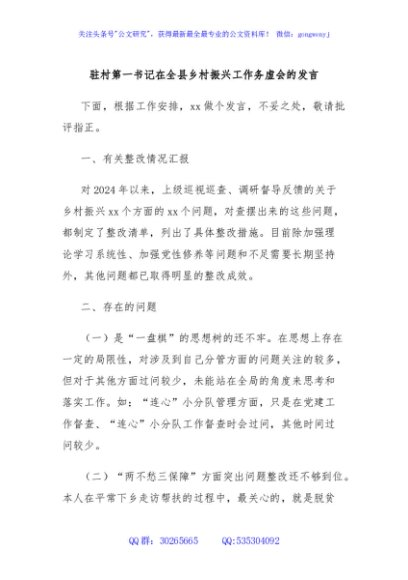 / 驻村第一书记在全县乡村振兴工作务虚会的发言