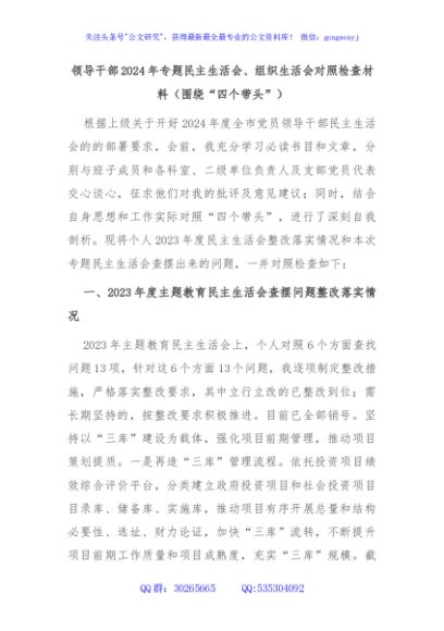 / 领导干部2024年专题民主生活会、组织生活会对照检查材料(围绕“四个带头”)