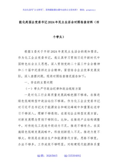 / 能化类国企党委书记2024年民主生活会对照检查材料(四个带头)