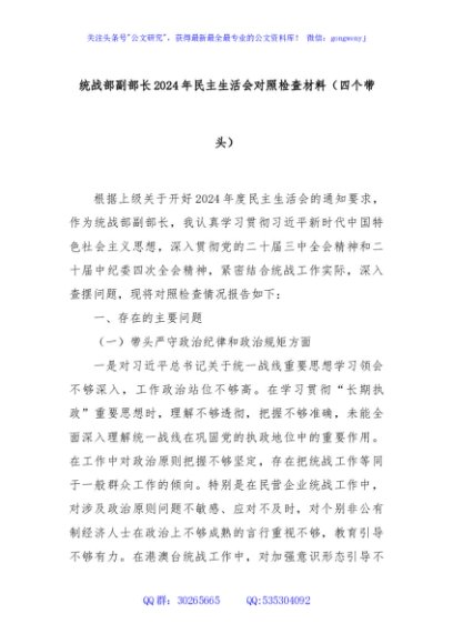 / 统战部副部长2024年民主生活会对照检查材料(四个带头)