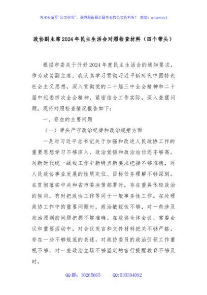 / 政协副主席2024年民主生活会对照检查材料(四个带头)