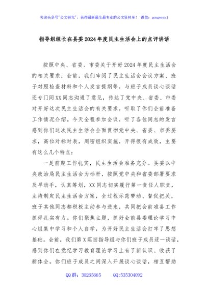 / 指导组组长在县委2024年度民主生活会上的点评讲话