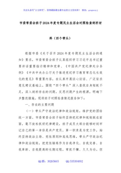 / 市委常委会班子2024年度专题民主生活会对照检查剖析材料(四个带头)