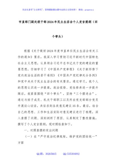/ 市直部门副处级干部2024年民主生活会个人发言提纲(四个带头)