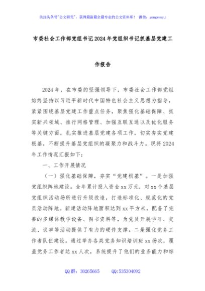 / 市委社会工作部党组书记2024年党组织书记抓基层党建工作报告