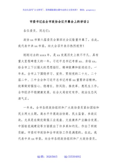/ 市委书记在全市政协会议开幕会上的讲话2