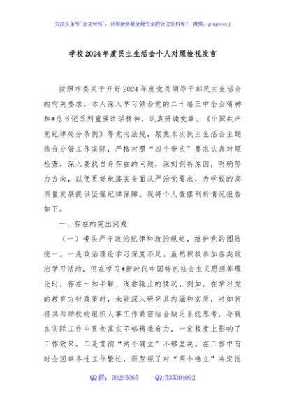/ 学校2024年度民主生活会个人对照检视发言