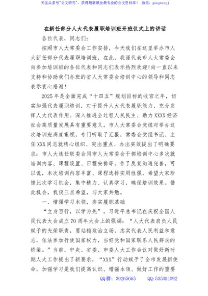 / 在新任部分人大代表履职培训班开班仪式上的讲话