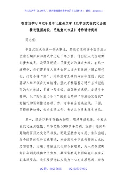 / 在传达学习习近平总书记重要文章《以中国式现代化全面推进强国建设、民族复兴伟业》时的讲话提纲