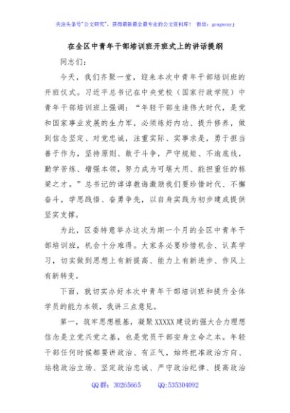 / 在全区中青年干部培训班开班式上的讲话提纲
