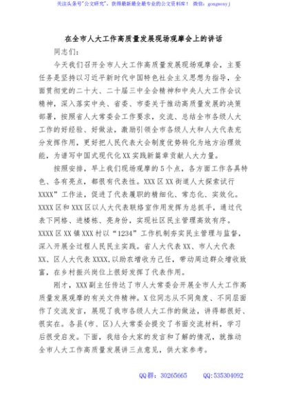 / 在全市人大工作高质量发展现场观摩会上的讲话