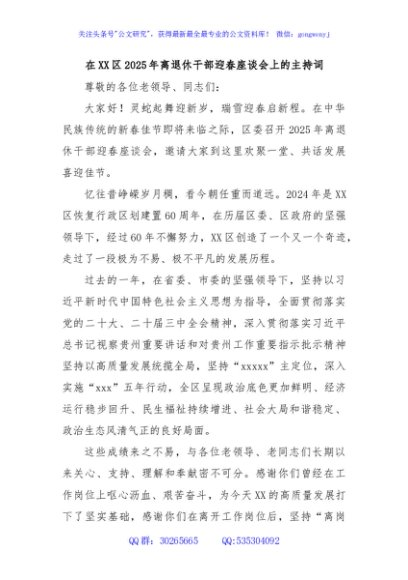 / 在XX区2025年离退休干部迎春座谈会上的主持词